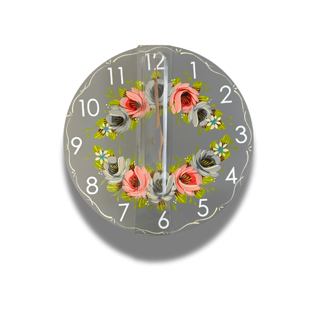 Decorative Clock Wooden - Hand Painted Rose & Castle Design - Grey