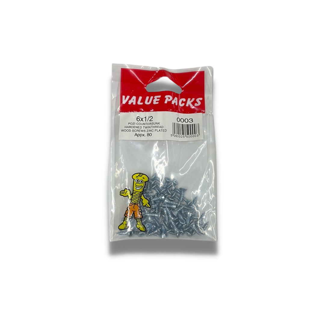 This Value Pack Twin Thread Wood Screws 6 x 1/2" contains approximately 80 screws, perfect for a variety of projects requiring a reliable fastener. The twin thread design offers a secure hold and ensures a tight fit in any type of wood